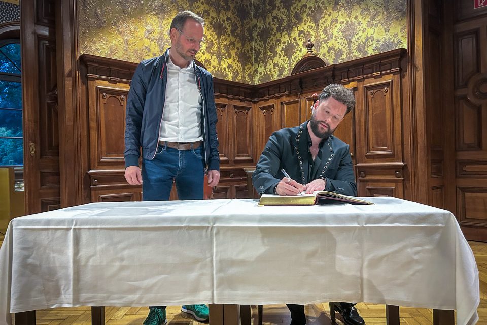 Der britische Popsänger Calum Scott hat sich beim diesjährigen SWR3 New Pop Festival im Beisein von Erster Bürgermeister Alexander Wieland im besonderen Ambiente des Fürstenzimmer im TOCCARION in das Goldene Buch der Stadt eingetragen. Anlass war das Homecoming-Konzert des 36-Jährigen, der am Sonntagabend gemeinsam mit der SWR Big Band im Festspielhaus auftrat. Bei der Eintragung hinterließ Scott den Gruß „Alles Liebe“ und bedankte sich damit für den herzlichen Empfang in Baden-Baden. Bereits vor drei Jahren trat Scott als Newcomer beim New Pop auf und hat sich seitdem zu einem international bekannten Musiker entwickelt. Mit seiner emotionalen Stimme und seiner authentischen Bühnenpräsenz begeistert er ein breites Publikum.